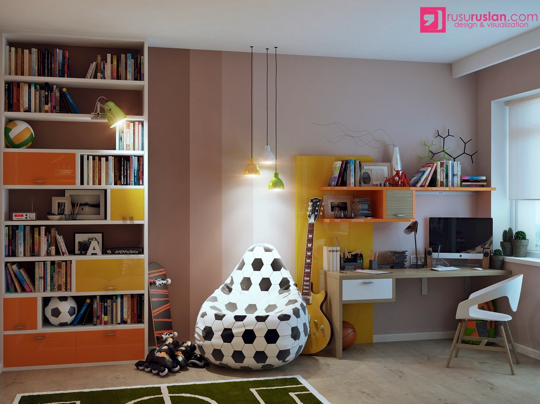 Модерна детска стая с интериорен дизайн подхождащ за малки деца и юноши. Мебели проектирани с изискване да са удобни за ползване с много открити рафтове и етежерки.