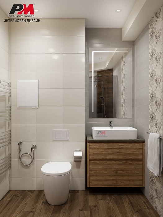 Интериорен проект на стилна баня в пастелни тонове и дървесни текстури